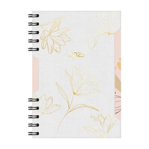 Atributos: capa em material diferenciado, detalhe em recorte, página decorada, miolo diário em 3 idiomas, wire-o preto fracionado.