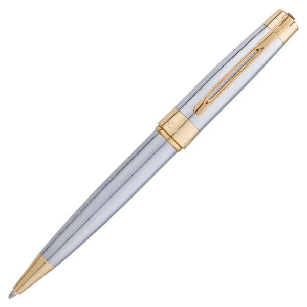 Prata com detalhes dourados tem sua escrita com conforto e maciez. Mecanismo de torção e com carga esferográfica padrão Parker