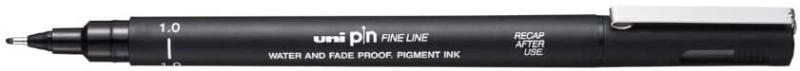 A caneta nanquim Uni Pin é fabricada pela Mitsubishi no Japão, muito conhecida por sua ponta sintética de alta tecnologia, que garante um melhor fluxo da tinta e maior precisão no traço. Possui alta durabilidade, usabilidade e rendimento. Sua maior característica é sua graduação de traço de 0,03 até 0,8mm