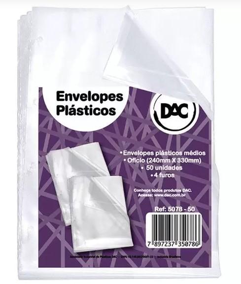 Pacote de envelopes médios. Ideal para organização, fichários e pastas, deixa seus documentos livre de danificações. Cor: Transparente.Formatos: Ofício - 240mm x 330mm.Quantidades: 50 envelopes por pacote.Espessura: Extra médio.Furações: Com 4 furos.Composição/Material: Polietileno. Embalagem: PCT.C/50
